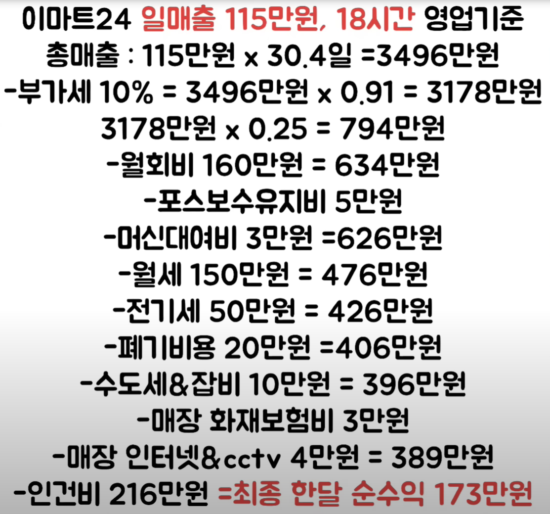 그럼 225시간 X 최저시급 9620원 하면 2,164,500원입니다. 그럼 389만 원에서 216만 원을 빼면 남는 173만 원이 됩니다. 이제 드디어 끝났습니다. 여러분들이 주 5일 하루 10시간은 빼먹지 않고 꼬박 같이 일했을 때 이마트 24 창업 후 하루도 안 빼고 100만 원 매출을 올려야 가져갈 수 있는 한 달 순수익이 173만 원입니다.