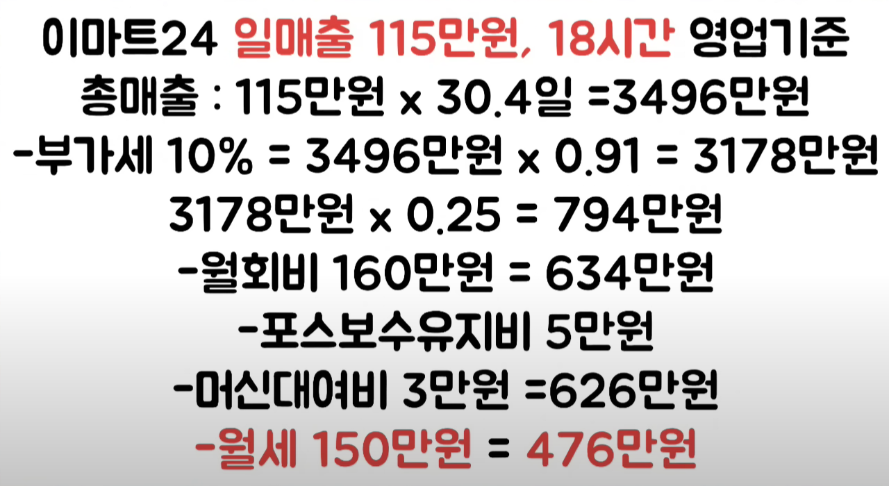 운영 비용 중에 가장 덩치가 큰 월세를 빼야죠? 서울의 경우 임대료가 기본 150에서 200은 그냥 넘어갑니다. 금 큰 편의점의 경우에는 300에서 400만 원까지도 월세가 들어갑니다. 그냥 좀 작은 규모라고 가정하고 한 달 월세를 150으로 산정하겠습니다. 620만 원 - 150만 원 하면 476만 원 이제 476만 원이 남았습니다