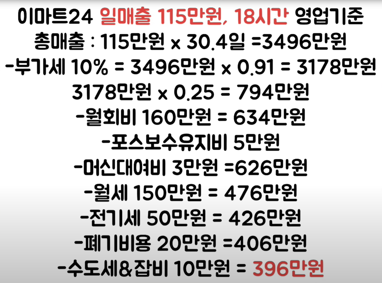 이마트 24는 GS25나 CU와는 달리 상품 마진율이 낮은 편입니다. 그리고 담배 비중이 높은 곳은 마진율이 더 떨어지게 됩니다. 이 기준으로 24~25% 정도면 이마트 24 창업 후 꽤 마진이 잘 나오는 운영에 속한다고 할 수 있습니다. 그럼 마진율 25%를 기준으로 세부계산을 해보겠습니다.