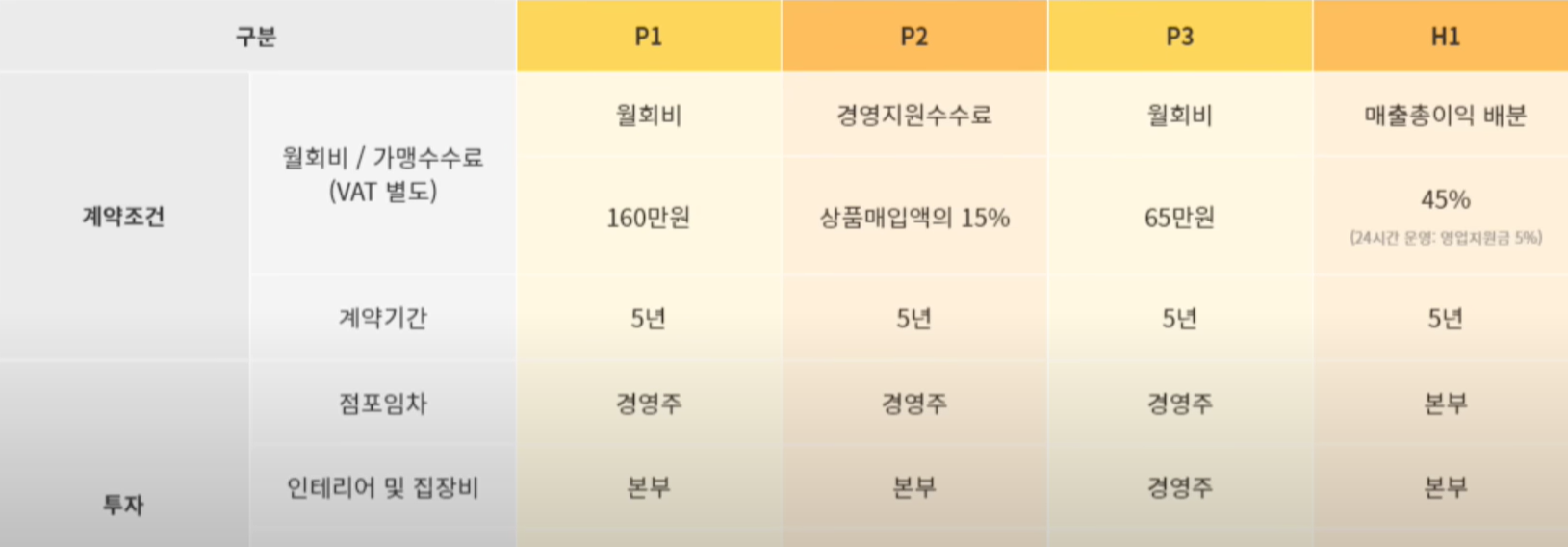 이 회비차감에 대해 계산하기 위해 이마트 24의 창업타입을 먼저 살펴보면 P1, P2, P3, H1 이렇게 4가지 타입으로 구분이 되어 있습니다. 가장 많이 선택하는 P1 같은 경우에는 회사가 인테리어시설비 모두 부담하는 대신경영주가 점포 임차비와 월회비를 많이 내는 구조이고 P3는 경영주가 시설과 인테리어 비용 모두 부담하는 대신 월회비가 좀 작은 타입입니다. 보통처음 창업하시는 분들은 초기투자비용을 줄이기 위해 P1 타입을 많이 하고 있습니다.