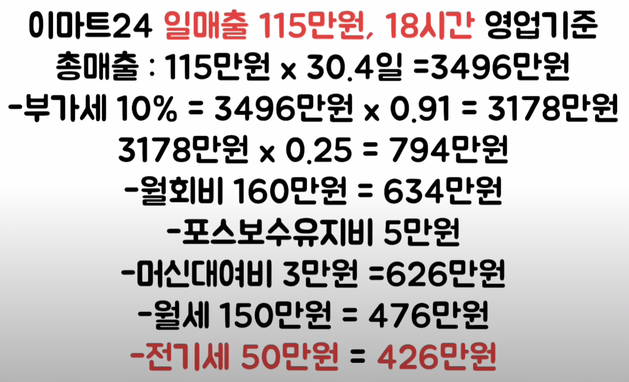 끝이 아닙니다. 아직 더 빼야 합니다. 전기세를 빼야겠죠. 비슷한 평수의 점포 같은 경우에는 한 달 평균 50만 원 정도 나오는 거 같습니다. 이번달은 전기세가 인상돼서 더 나온 거 같긴 한데 전기세 기준은 그냥 50만 원으로 계산해 보겠습니다. 476만 원 - 50만 원은 426만 원입니다. 이제 여기서 뭘 더 빼야 될까요? 편의점은 또 폐기 비용을 빼야 됩니다. 여기서 폐기 비용이란 삼각김밥 도시락 샌드위치 등등 신선식품을 유통기안 안에 판매하지 못해 폐기되는 경우 폐기비용이라고 합니다.