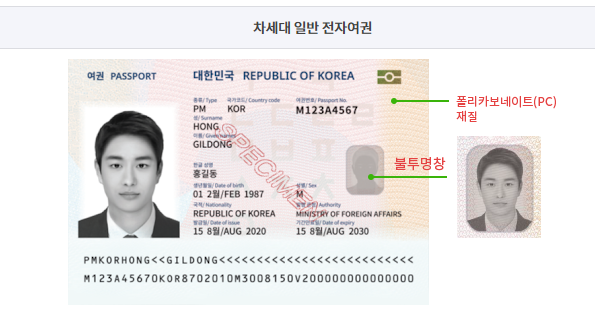 예전 여권이 전면 종이로 되어 있는 것에 비하여 차세대 전자여권은 개인정보면이 폴리카보네이트 재질(플라스틱)로 변경된 것이 가장 큰 특징입니다.